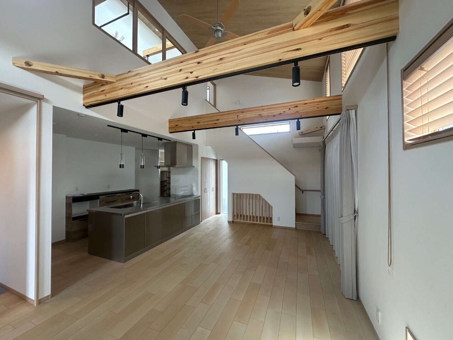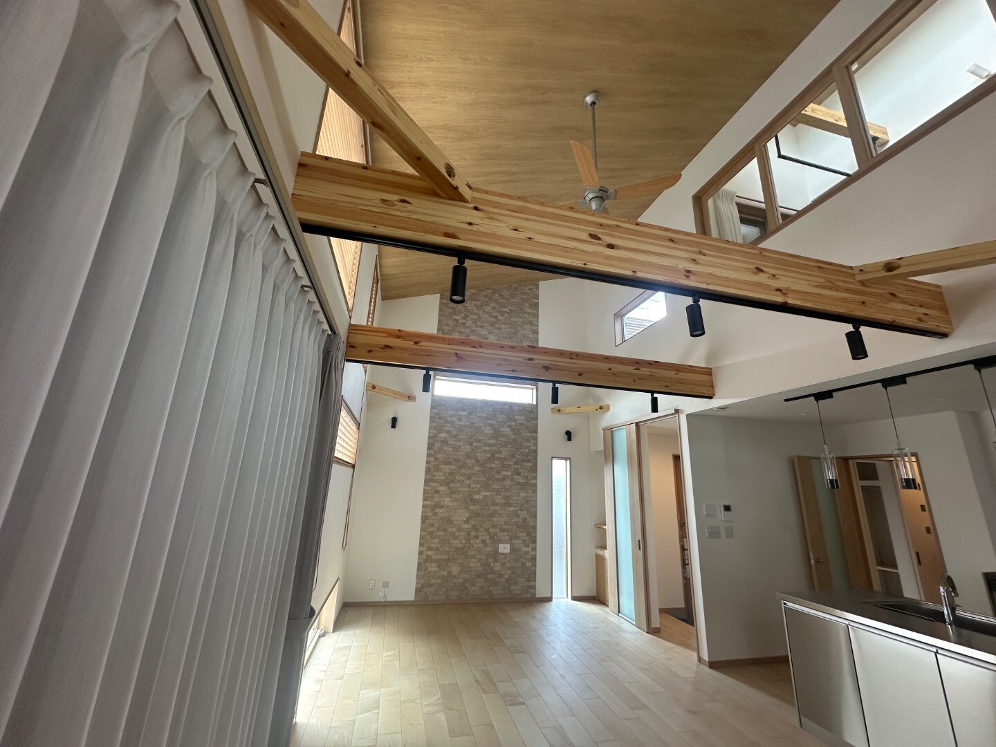 今回の木造新築工事では、吹き抜けのあるリビングを採用しました。