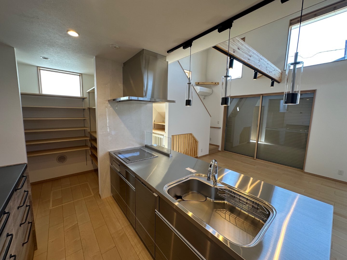 吹き抜けのあるリビング、アイランドキッチン、豊富な収納、パントリーを取り入れた、暮らしやすさにこだわった住まいです。