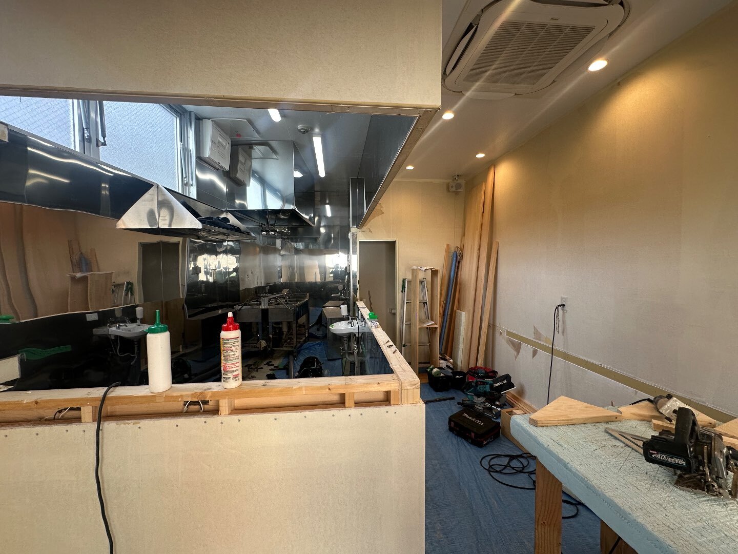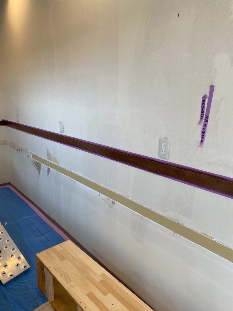 飲食スペースは壁紙の張り分けをする為に見切りを設置。